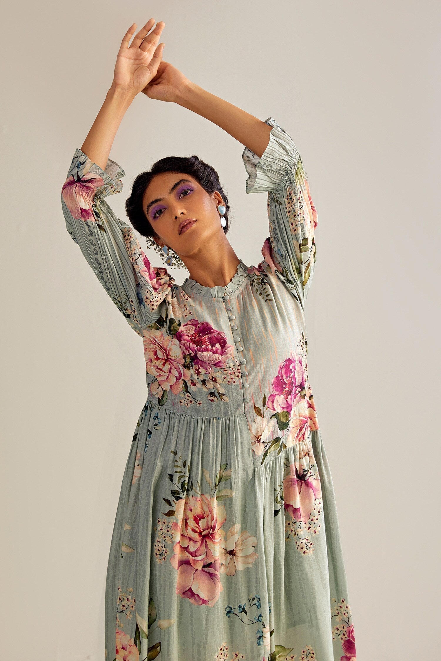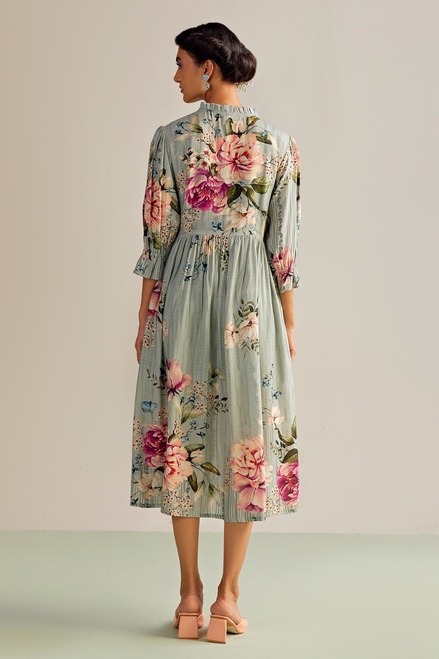 Aqua cotton silk dress with floral printed motifs.