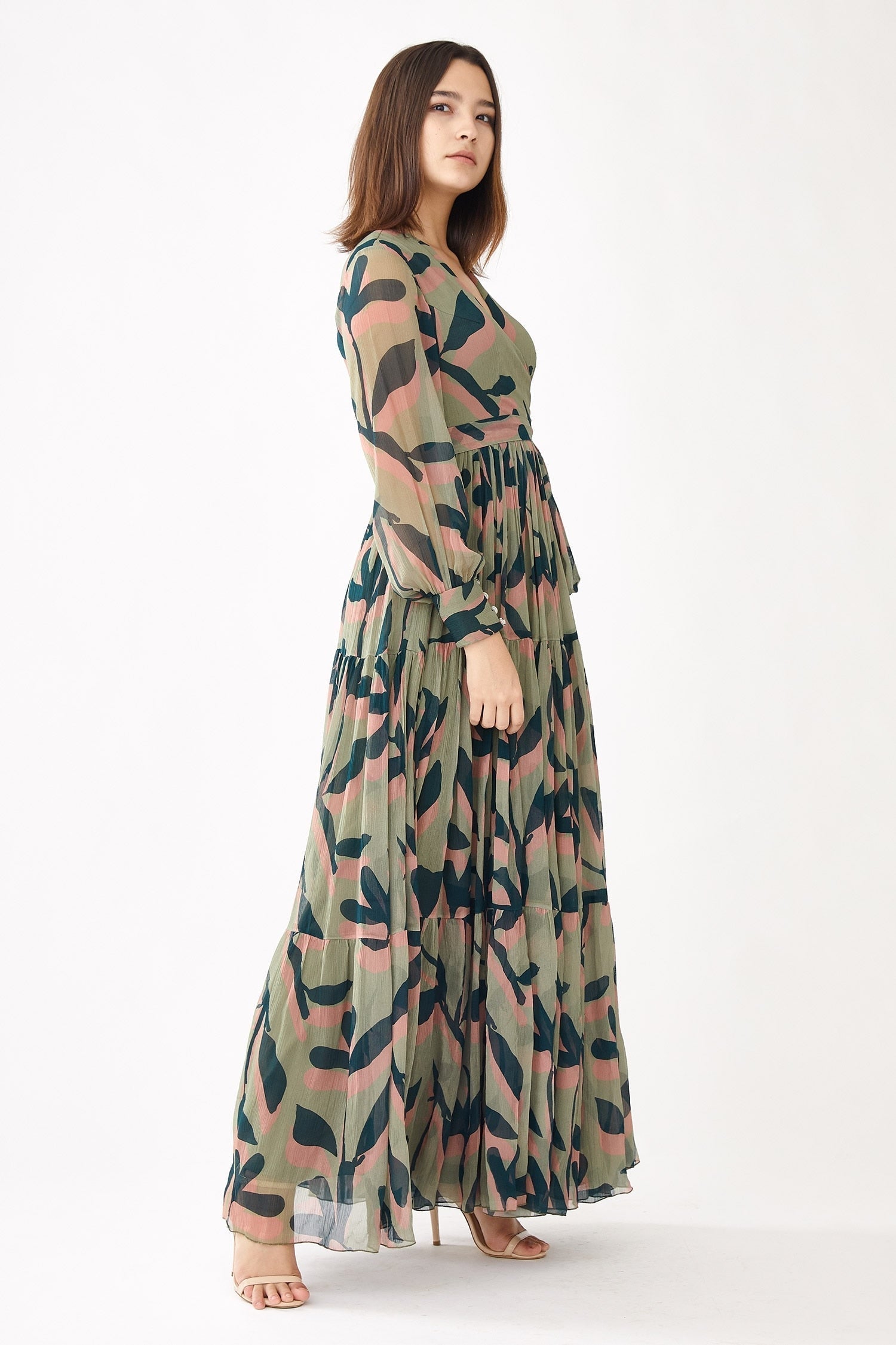 Olive green wrap dress with pink floral print and tiered hem.